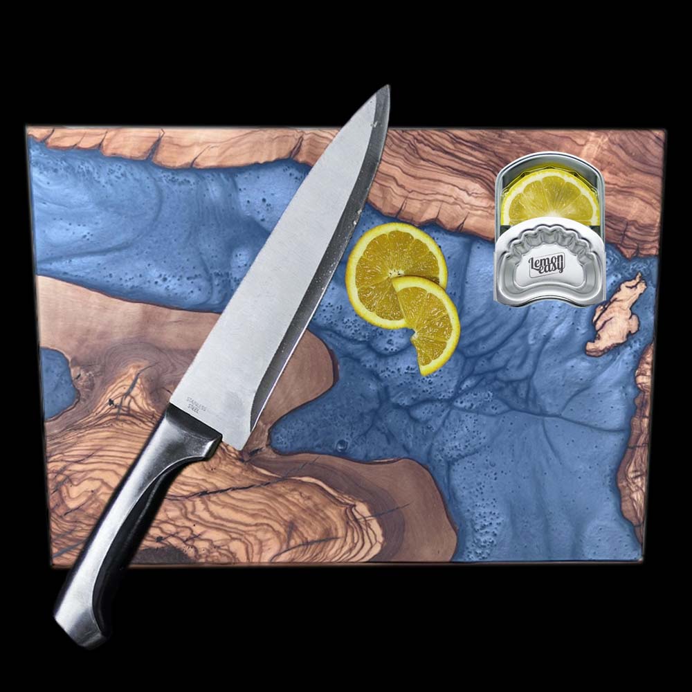 Das Olivenholz zeichnet sich durch seine aussergewöhnliche Härte und natürliche antibakterielle Wirkung aus, wodurch es sich hervorragend für den täglichen Gebrauch eignet. Der graue Epoxidharz-Akzent setzt einen modernen, zeitlosen Akzent, der zu jeder Kücheneinrichtung passt.