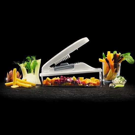 Ganz einfach können zum Beispiel Möhrenwürfel für eine Suppeneinlage gehackt oder die Zutaten für eine Gemüsepfanne oder einen leckeren Obstsalat verarbeitet werden. Auch Rohkoststicks, die anschliessend mit frischem Dip serviert werden, gelingen im Nu: Einfach das zu schneidende Obst oder Gemüse auf die Klinge legen oder leicht andrücken und den Hebel mit etwas Schwung herunterdrücken.